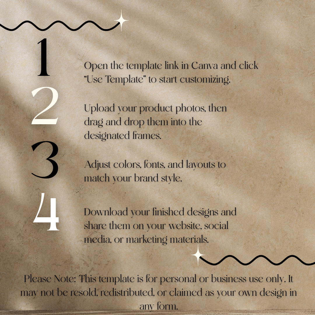 Once your purchase is complete on Shopify, you’ll instantly receive a PDF with your Canva access link—simply click, open in Canva, and start editing.